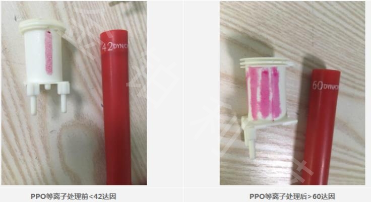典型塑料材料:像PVC,PP,甚至還有PTFE等塑料,親水性往往很差,即使我們使用30的達因筆進行表面測試,劃在這些材料表面,墨跡立馬聚集在了一起,像這樣的效果如果是直接做粘接、或者印刷,是肯定會出現質量問題的。想要改善這鐘情況,就需要提升塑料產品表面的達因值,其中最為簡單、環保的方法就是使用等離子清洗機處理表面,處理后達因值能達到60-70達因。